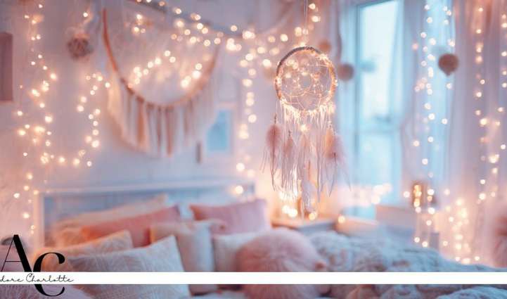 Drift off under a twinkling canopy of string lights draped above your bed like a blanket of stars.