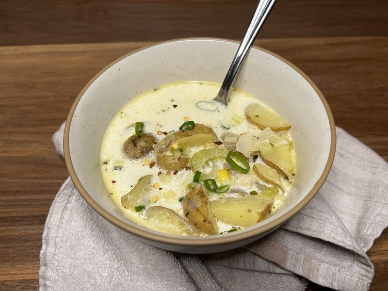 This chowder is smoky, sweet, and creamy all at once. Roasted poblanos bring a subtle heat, while fresh or frozen corn adds that pop of texture. It’s a soup that tastes like something you’d get at a trendy café—but can absolutely be made in your slippers.