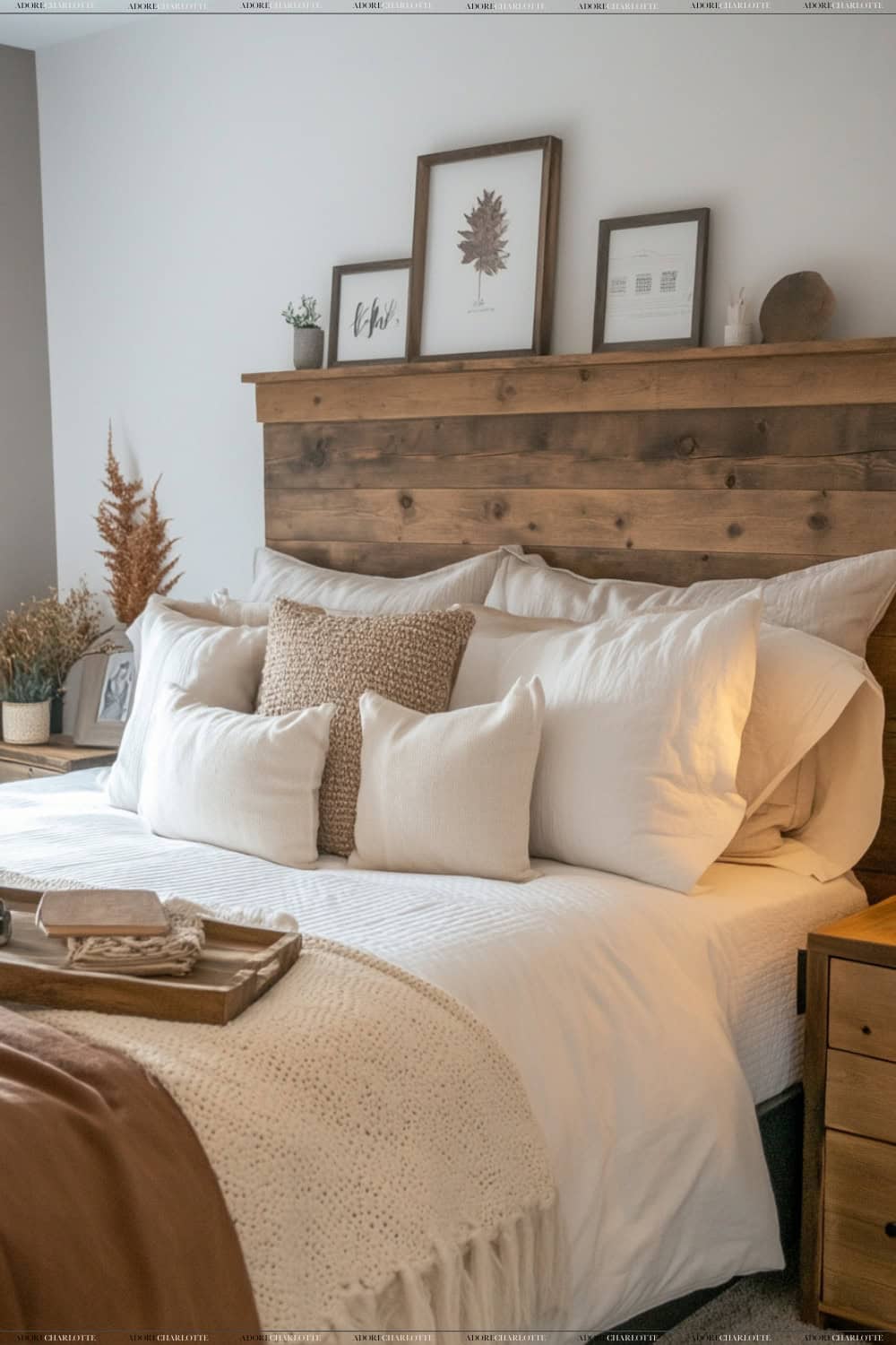 Rustic wood elements can add warmth and an autumnal touch to your bedroom decor. Consider adding a wooden headboard, side tables, or decorative accents like wooden trays or picture frames. The natural wood tones complement the cozy fall bedroom decor color palette, enhancing the rustic and cozy atmosphere of the season.
