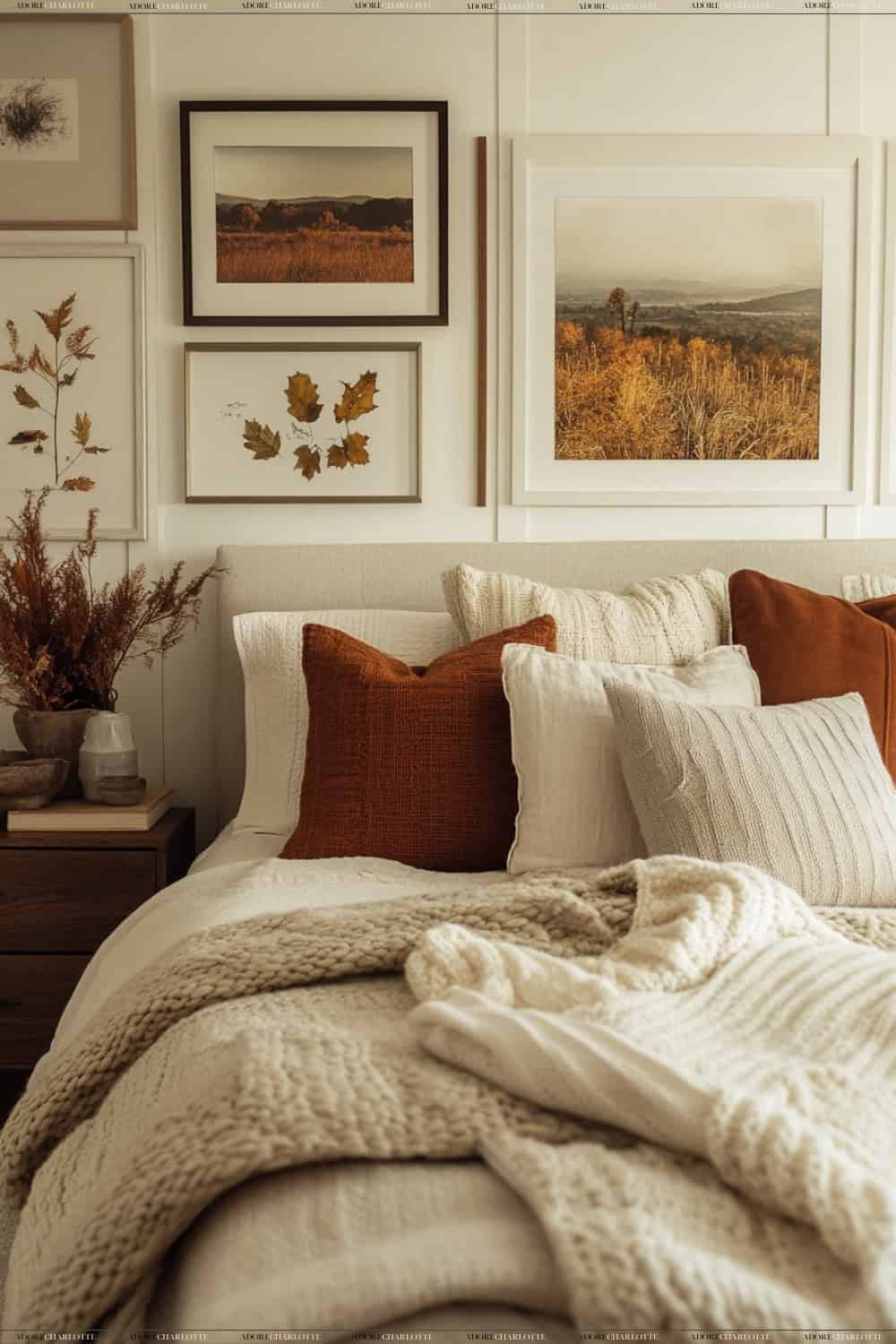 Swapping out your wall art for something seasonal can easily transition your bedroom into fall. Look for prints or canvases with autumn landscapes, leaf motifs, or warm-toned abstract art. A gallery wall featuring fall-inspired images can make a significant impact and become the focal point of your room. It’s a great way to incorporate fall without overwhelming your space.