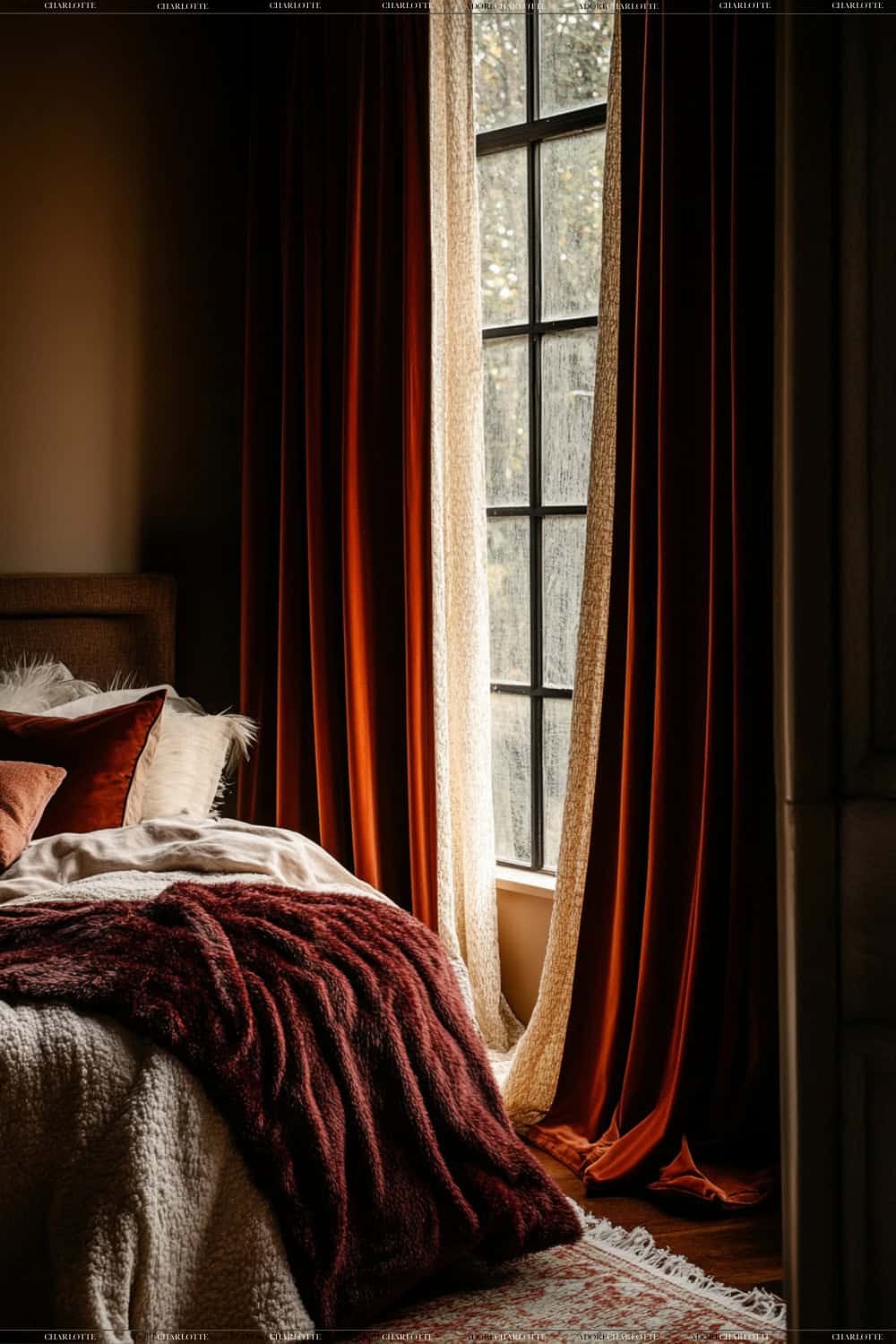 As temperatures drop, heavier curtains can serve a dual purpose. They keep your room insulated and warm and add a rich layer of texture to your fall bedroom decor. Opt for velvet, wool, or thick cotton curtains in deep autumn shades like burgundy, chocolate brown, or navy blue. These materials create a cozy atmosphere and add a dramatic, elegant touch to your space.