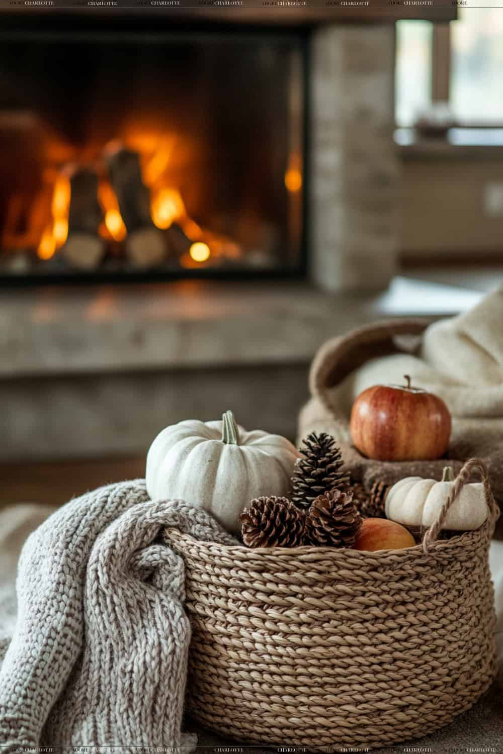 For a finishing touch, add decorative baskets filled with seasonal items like pinecones, pumpkins, apples, or blankets. Place them in your living room, hallway, or by the fireplace to create a warm, lived-in feel that’s perfect for fall.