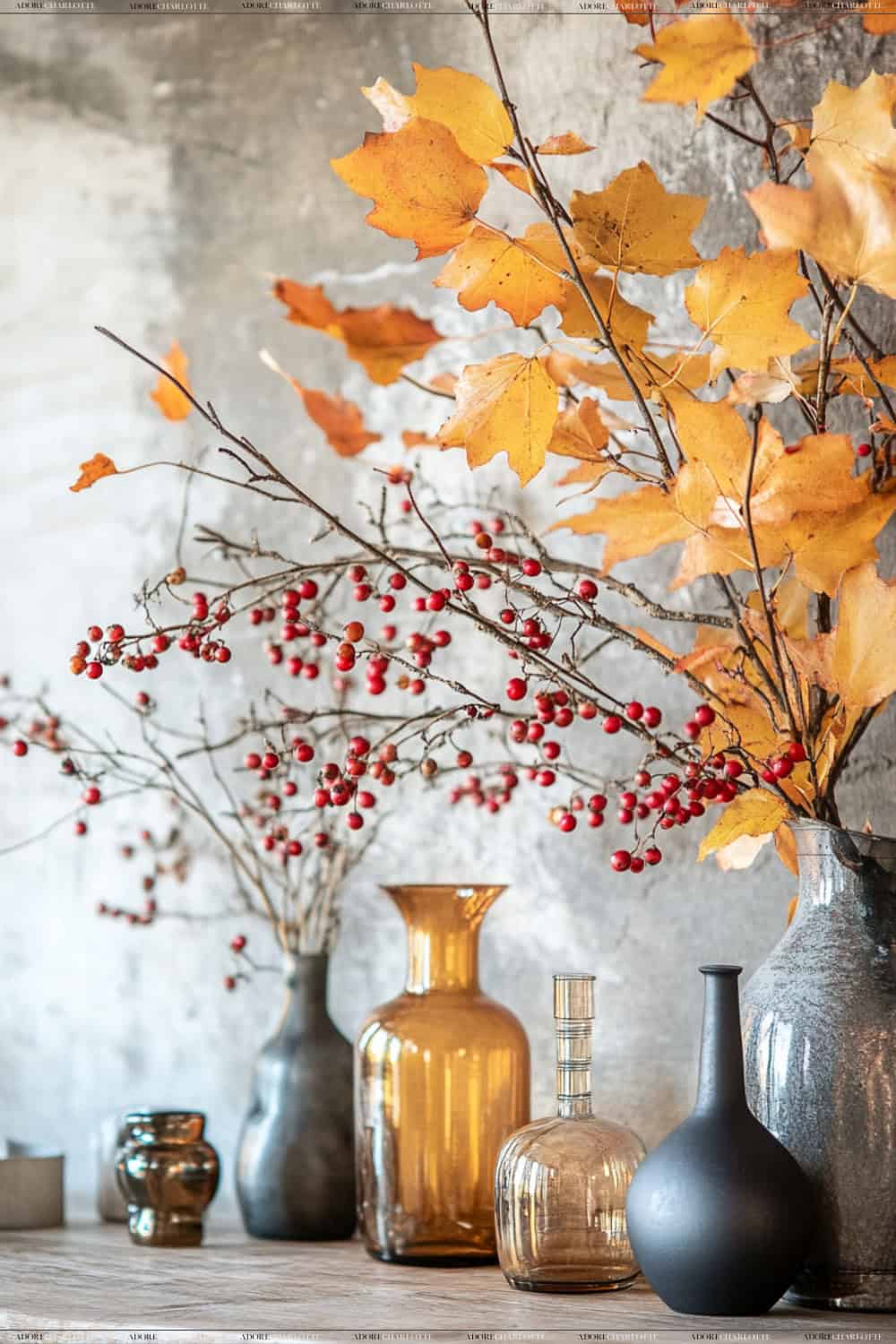 One of the easiest ways to bring fall indoors is by arranging fall foliage and branches in vases. Look for golden leaves, eucalyptus, or branches with red berries. These natural elements are perfect for entryways or dining tables, adding a fresh, organic feel to your space.