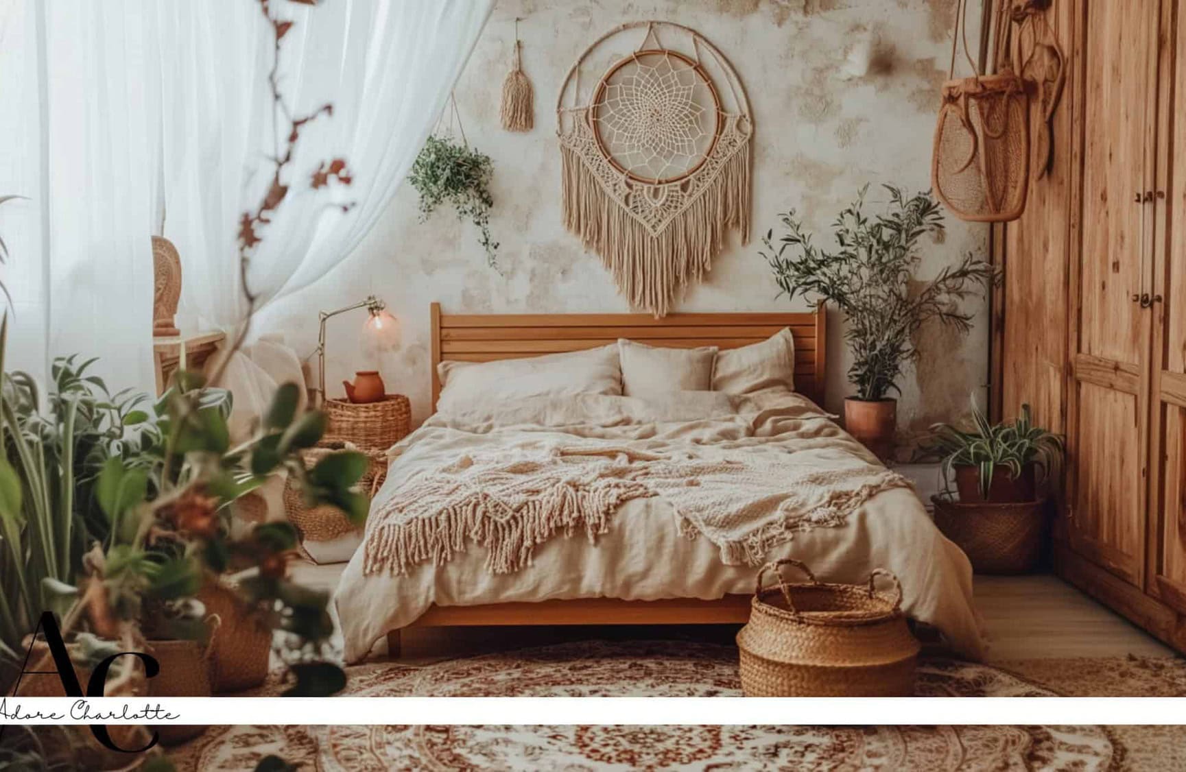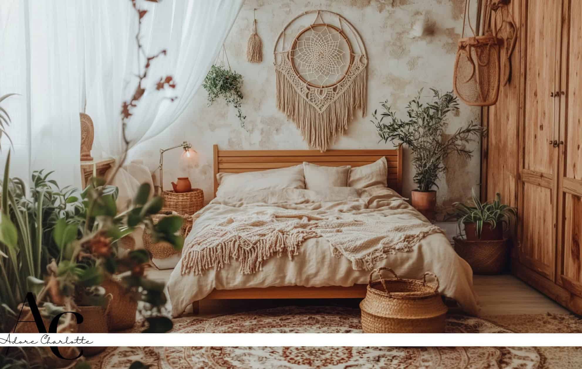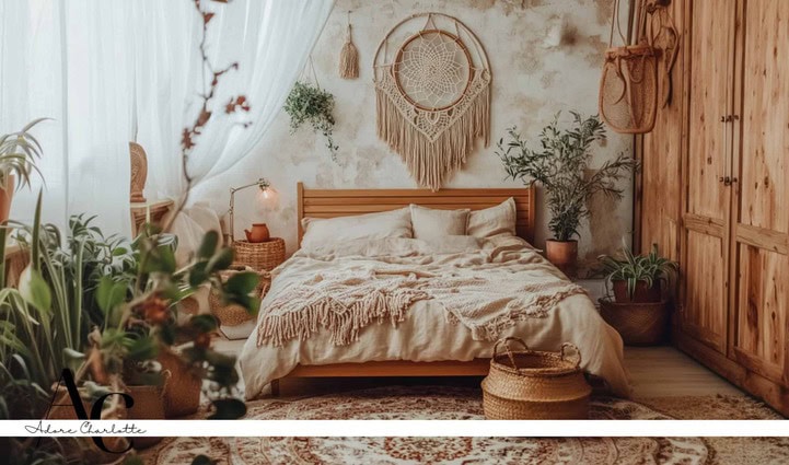 Key Elements: Natural wooden bed frames, jute rugs, soft beige linens, and macramé wall hangings.