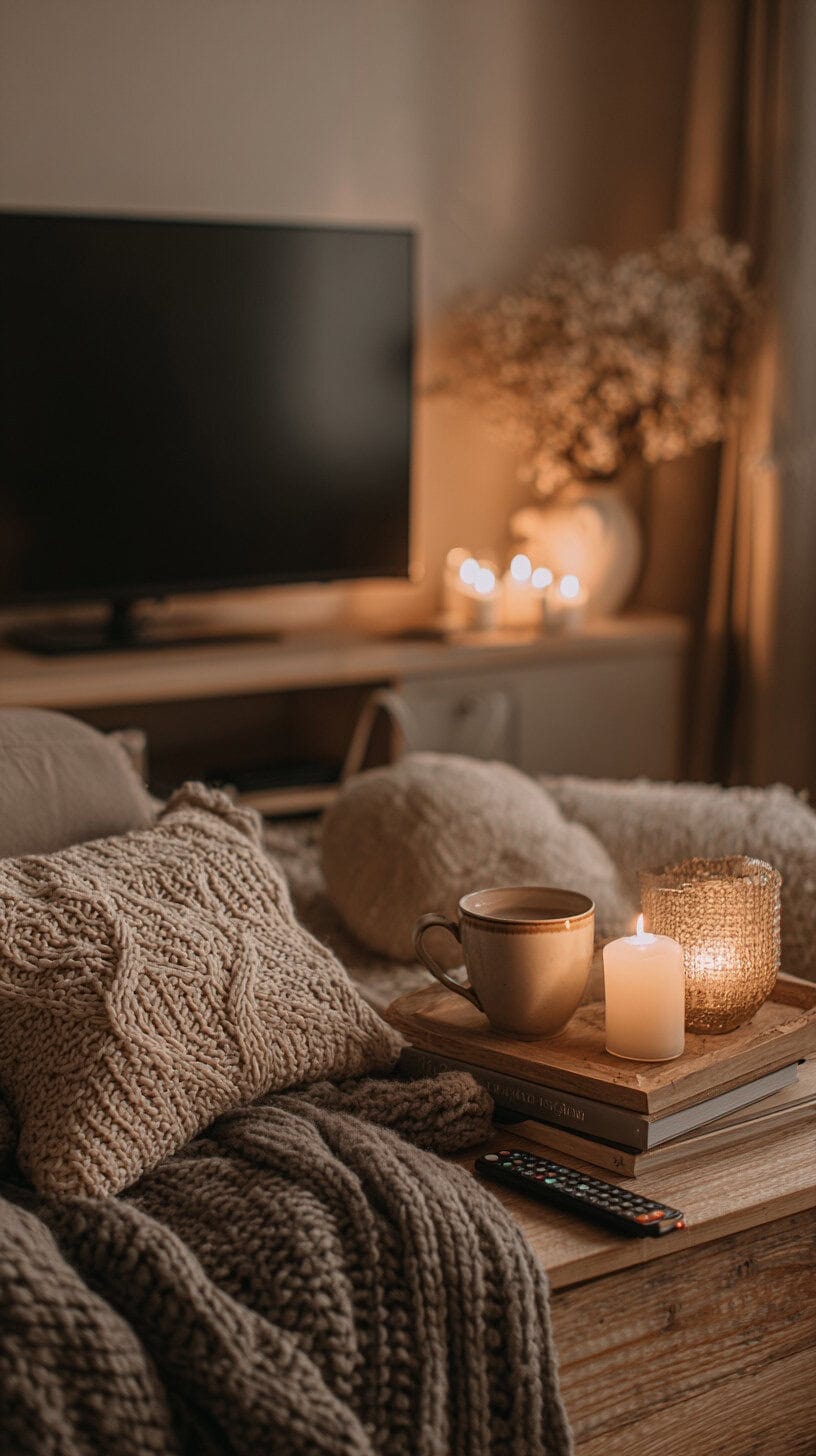 Don’t forget about lighting. Instead of harsh overhead lights, consider adding some soft, ambient lighting to make your space feel cosy. And if you really want to get into the zone, invest in something that keeps you warm, like a heated blanket.