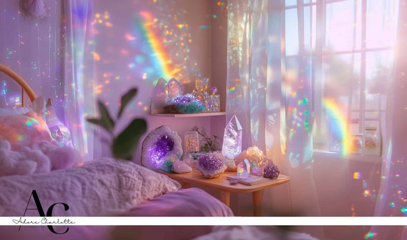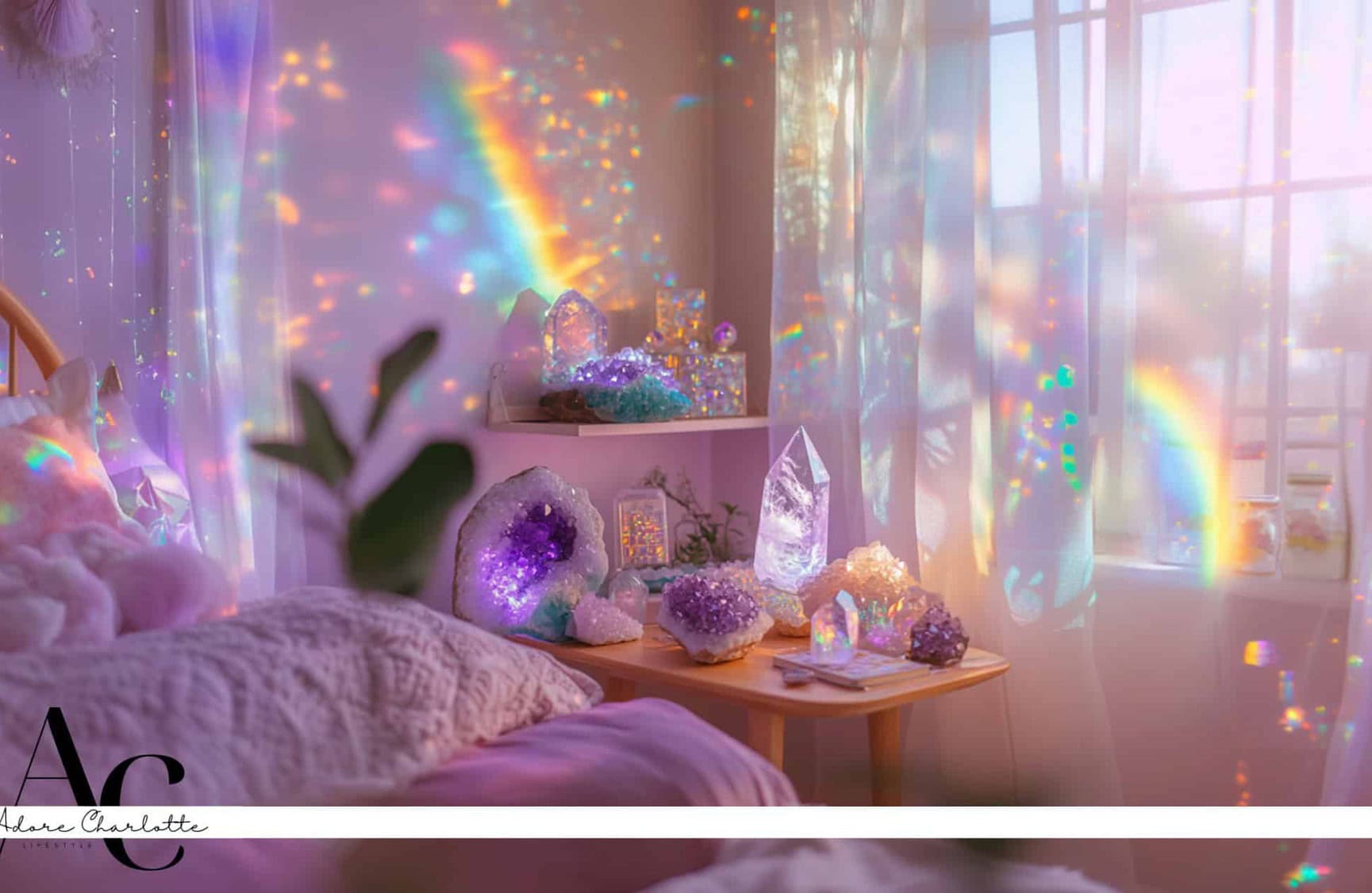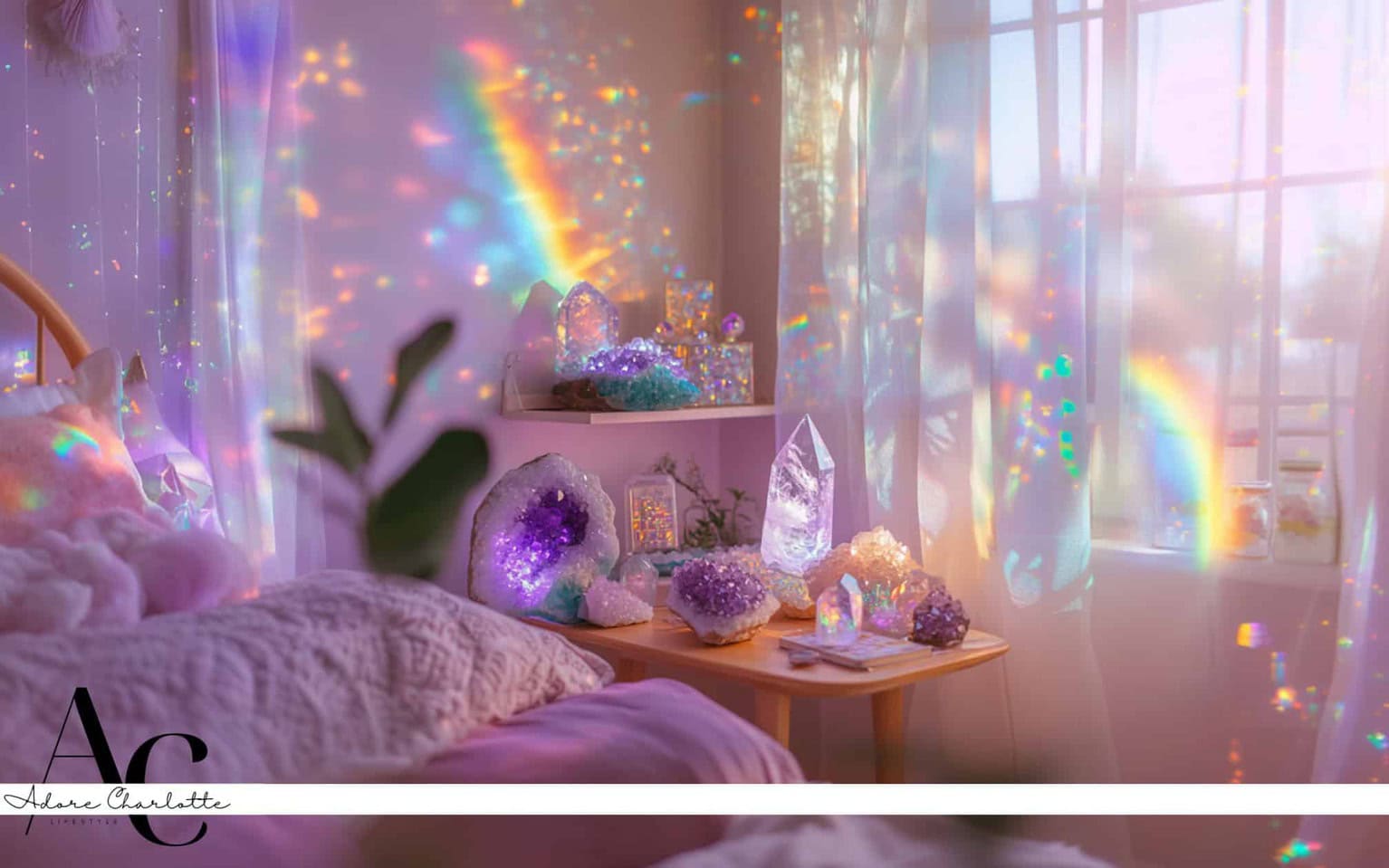 Harness the power of crystals to create a space filled with positive energy. Decorate your bedside tables, shelves, or windowsills with clusters of amethyst, rose quartz, or clear quartz. These stones are believed to promote relaxation, love, and healing. You can also hang a crystal prism in your window to let the light scatter into rainbows, filling your room with magical energy.